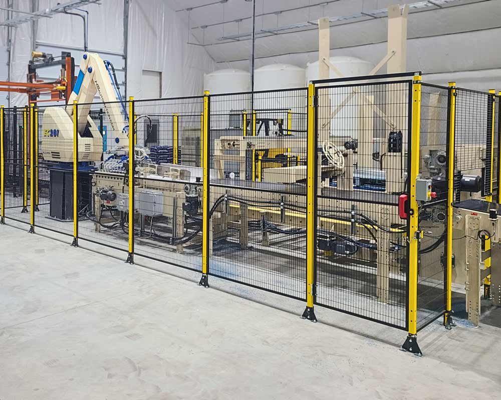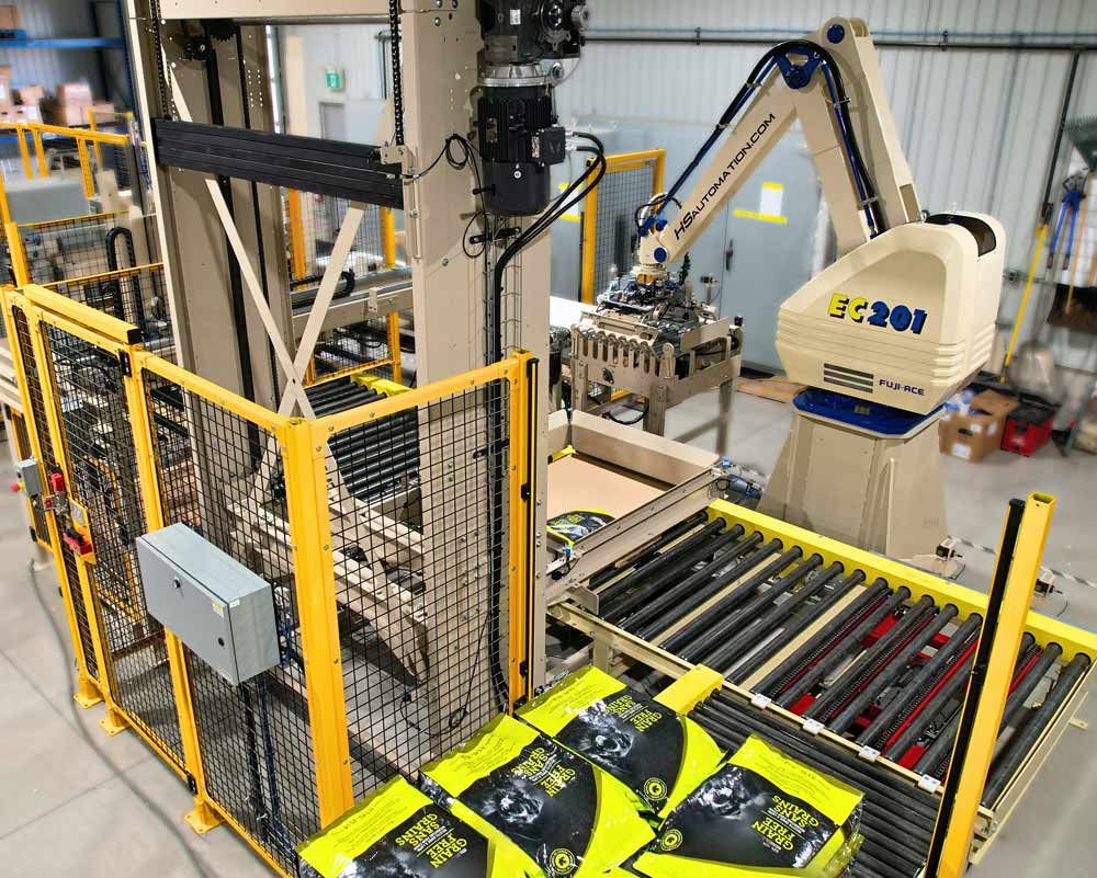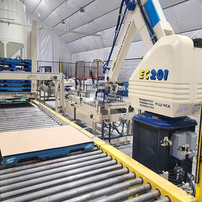 An Auto cell robotic palletizer is a good fit for high production. Our systems include a pallet dispenser, slip-sheet dispenser, conveyors, and auto wrapping station.
