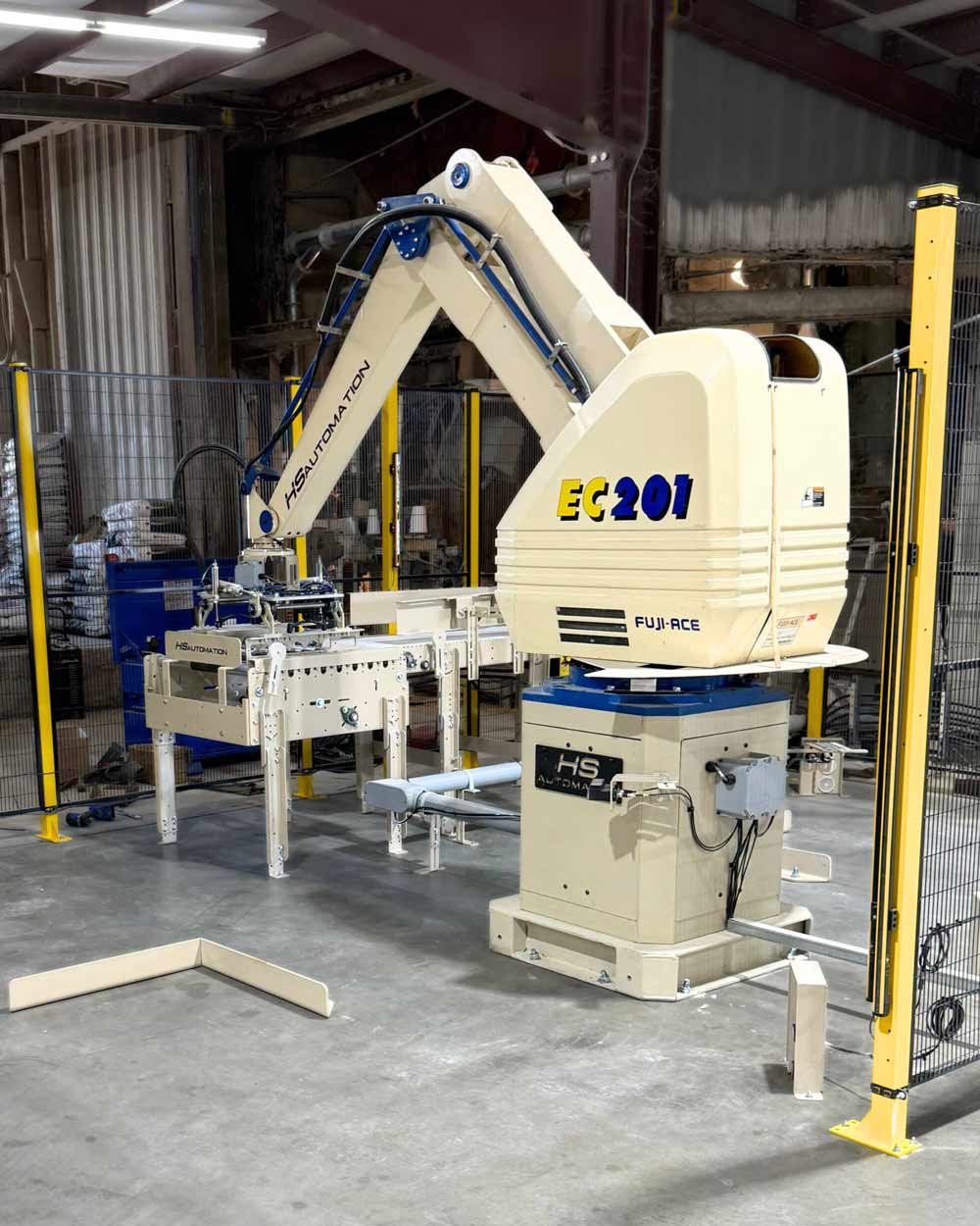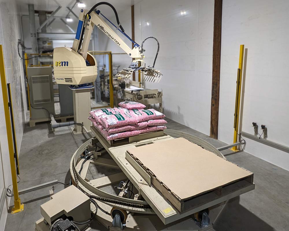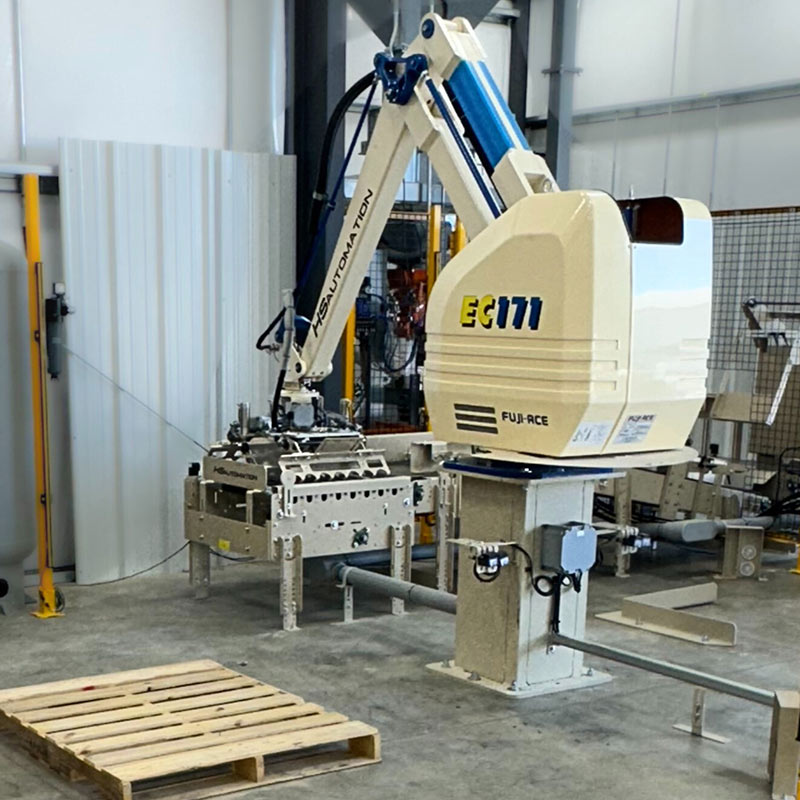 The advantage of dual cell palletizers is their smaller footprint and continuous operation. It is also very simple to operate and less expensive than an auto cell.