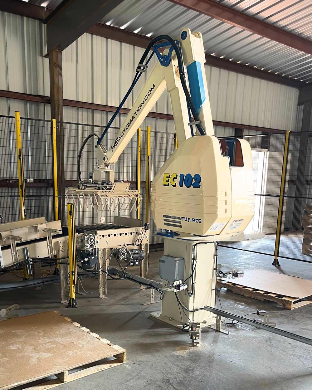 Our safety system: once the pallets are full at station #1 the robot automatically switches to station #2. Our safety system allows the forklift to enter stacking station #1 and remove the full pallet while the robot continues to stack station #2.